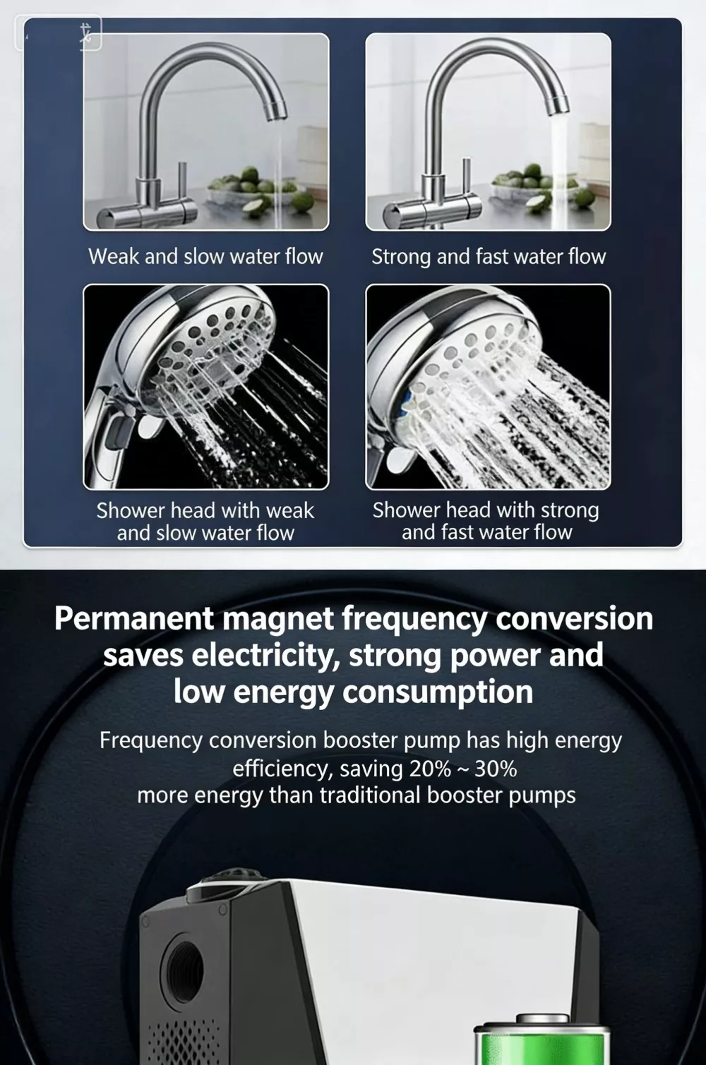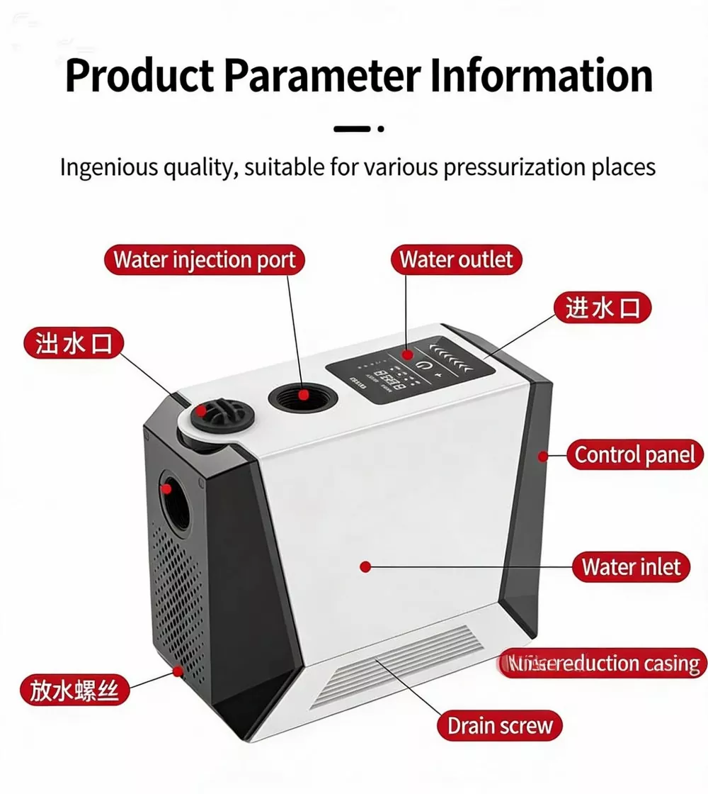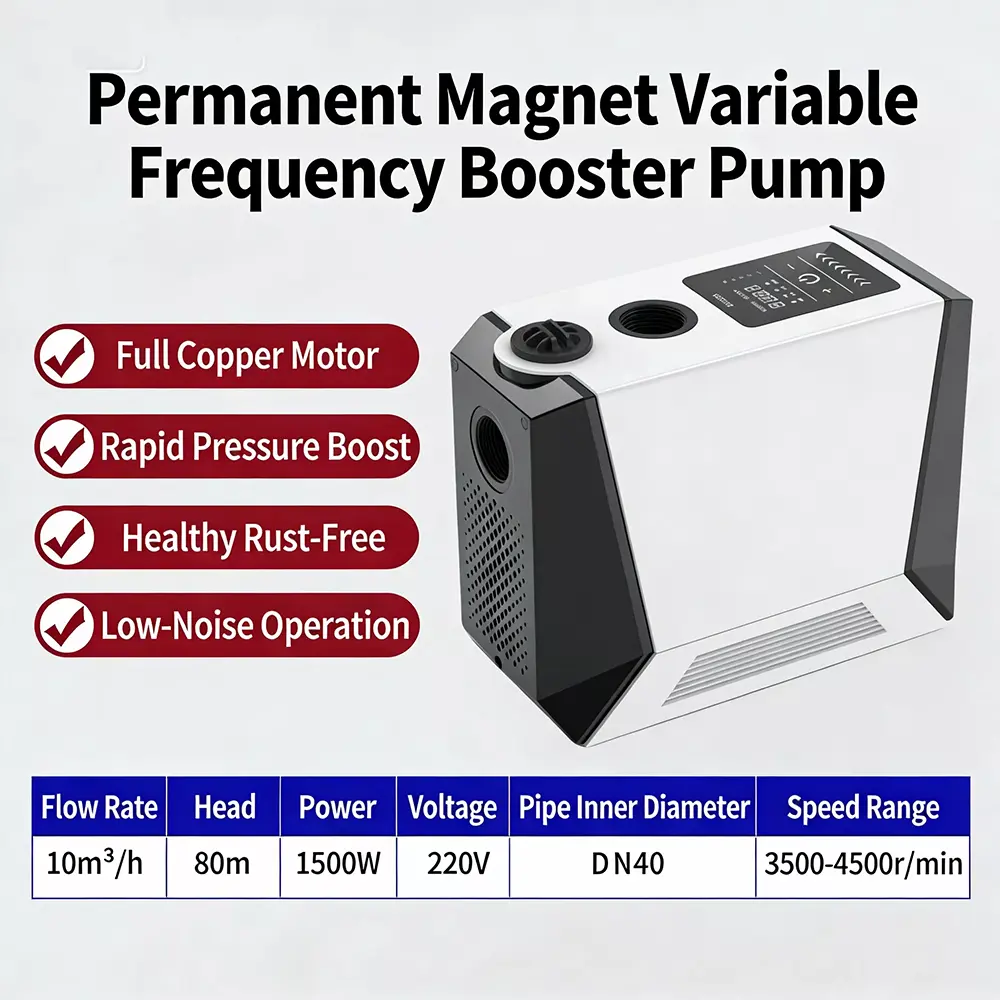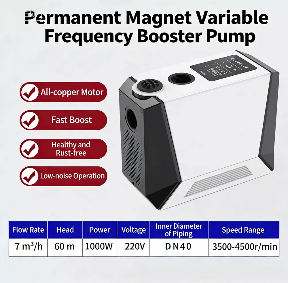 Specielt designet til store flade lejligheder og villaer, denne store intelligente boosterpumpe anvender avanceret børsteløs permanent magnet ren kobbermotorteknologi kombineret med et intelligent variabel frekvens kontrolsystem. Den realiserer automatisk start-stop og flergears trinløse hastighedsforøgelsesfunktioner. Udstyret med en digital kontrolskærm, har den et stilfuldt udseende, lille fodaftryk og nem installation. Stor intelligent boosterpumpe løser perfekt problemet med utilstrækkeligt husholdningsvandtryk og leverer en stabil, effektiv og ultra-støjsvag vandforsyningsoplevelse.