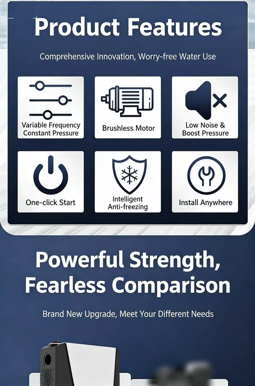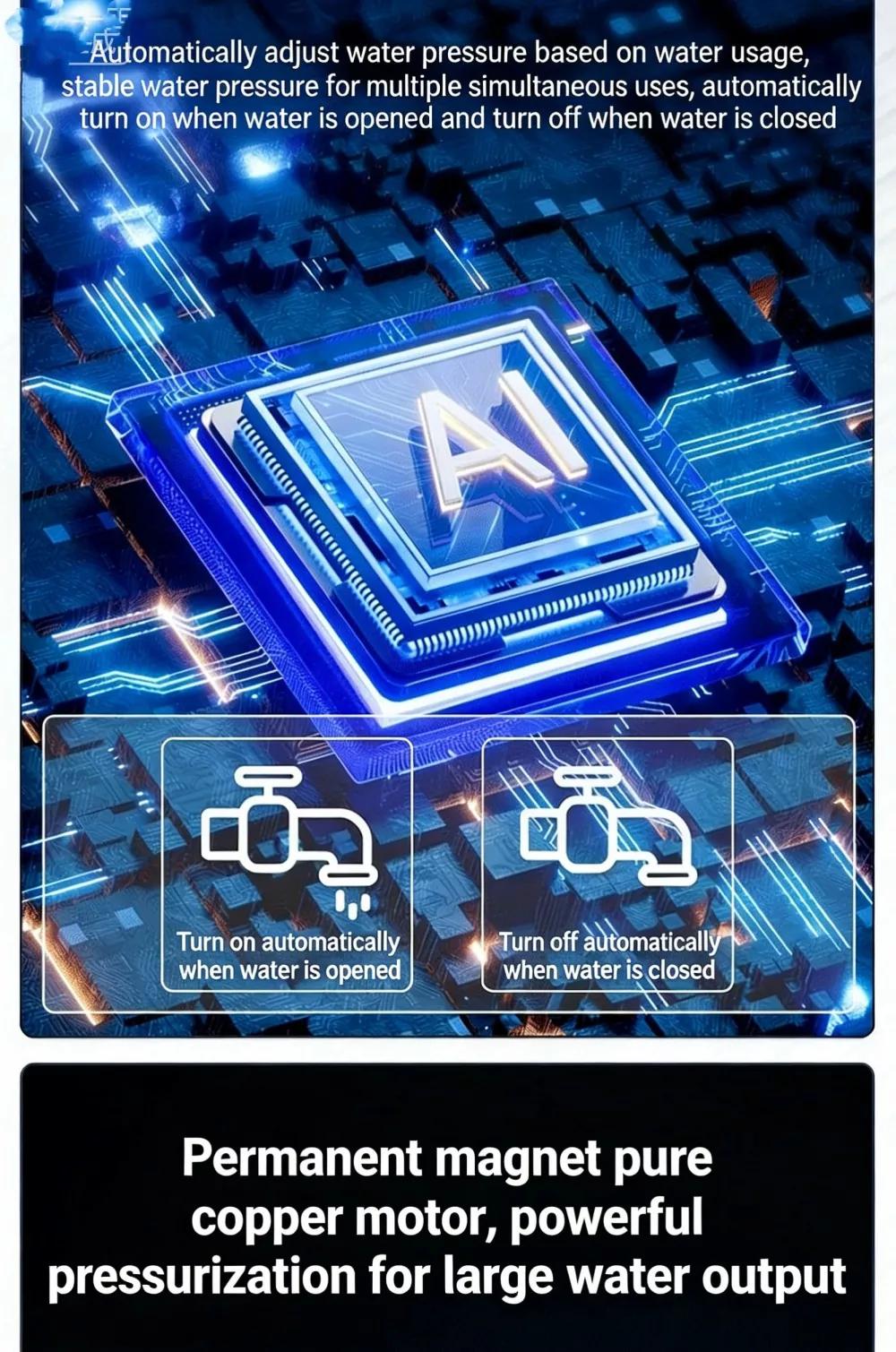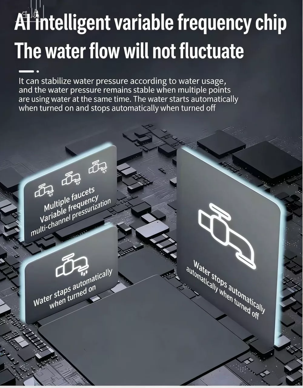 Specielt designet til store flade lejligheder og villaer, denne store intelligente boosterpumpe anvender avanceret børsteløs permanent magnet ren kobbermotorteknologi kombineret med et intelligent variabel frekvens kontrolsystem. Den realiserer automatisk start-stop og flergears trinløse hastighedsforøgelsesfunktioner. Udstyret med en digital kontrolskærm, har den et stilfuldt udseende, lille fodaftryk og nem installation. Stor intelligent boosterpumpe løser perfekt problemet med utilstrækkeligt husholdningsvandtryk og leverer en stabil, effektiv og ultra-støjsvag vandforsyningsoplevelse.
