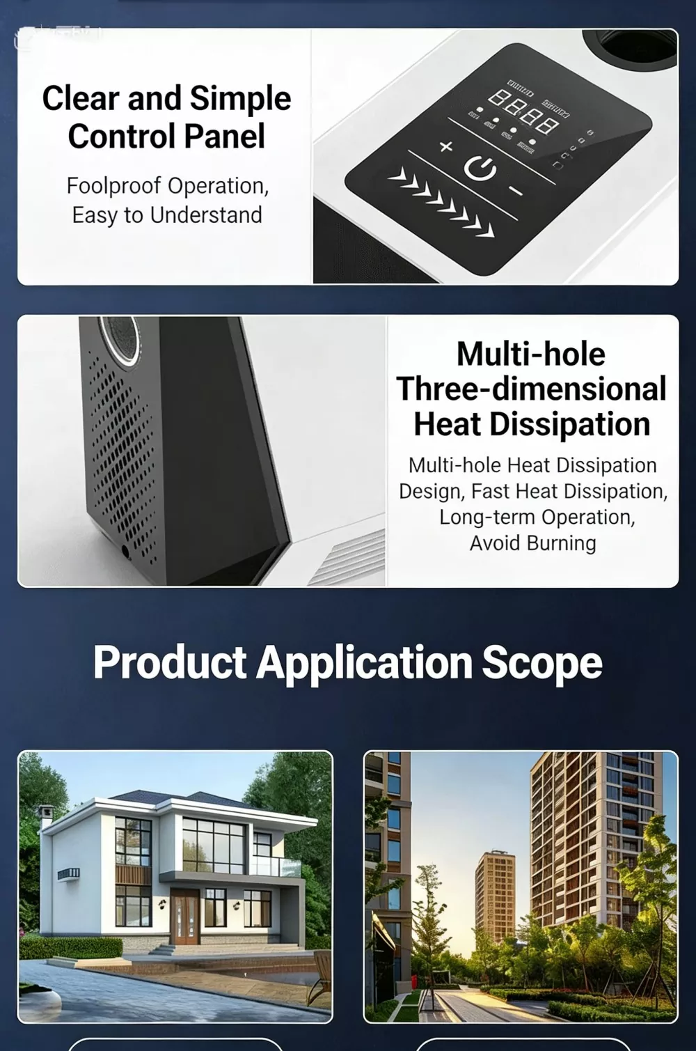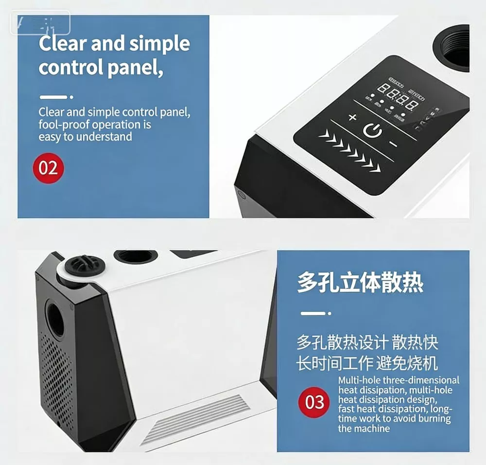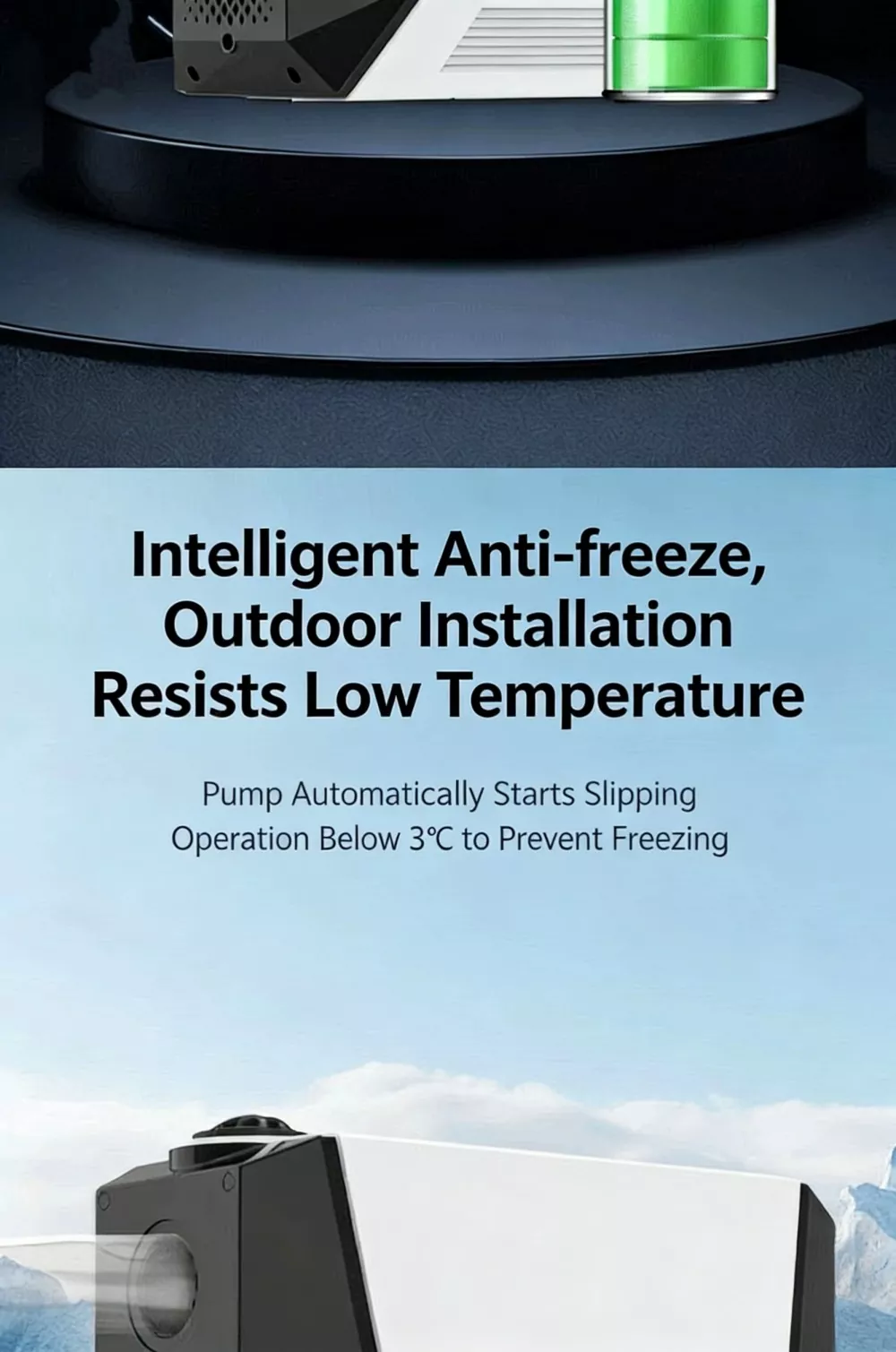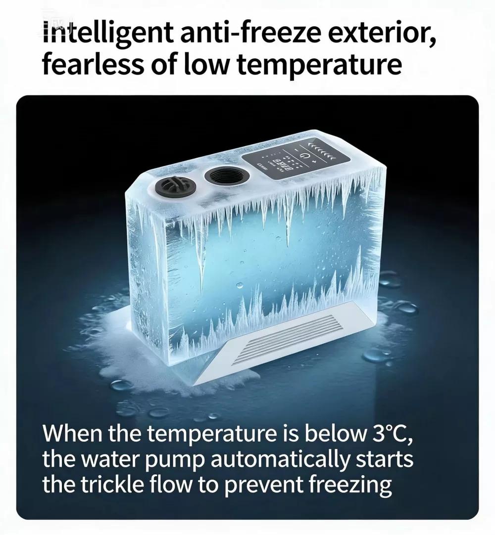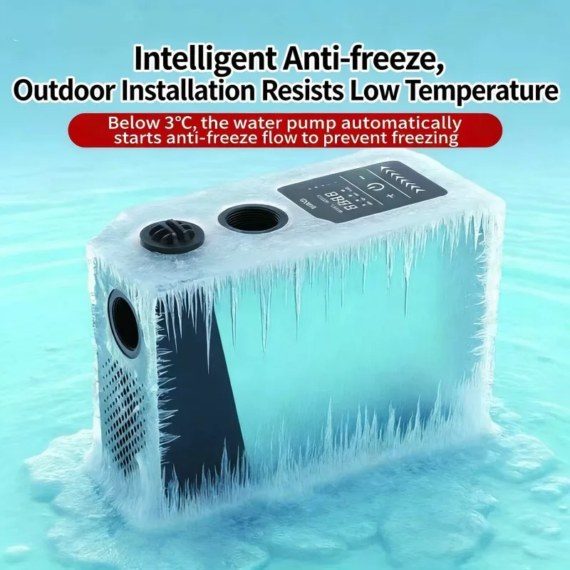 Indbygget intelligent anti-frost varmesystem aktiveres automatisk, når omgivelsestemperaturen falder til under -3°C, forhindrer pumpen i at revne i koldt vejr og forlænger udstyrets levetid, ideel til kolde områder.