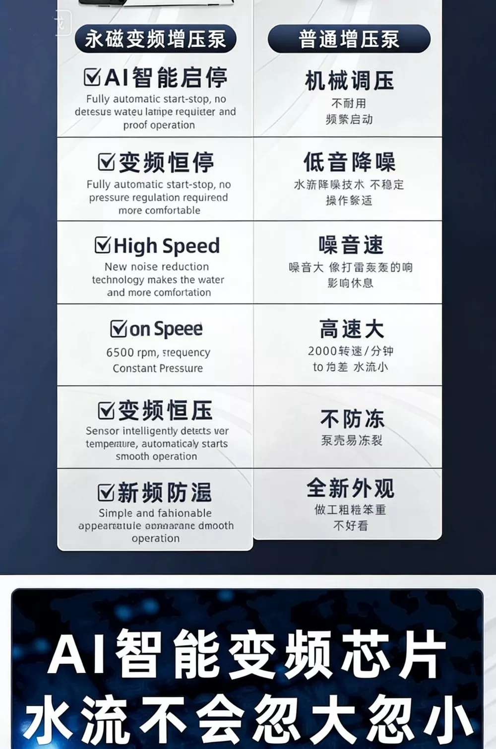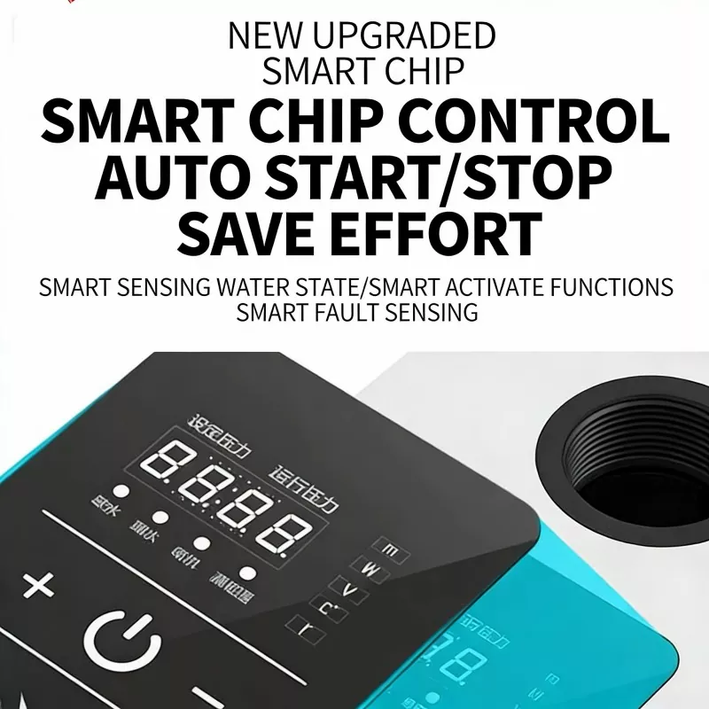 High-end chip digital skærm med klar intuitiv grænseflade for nem betjening. Realtidsovervågning af vandtryk, flowhastighed og rotationshastighed; 1-tast gearjustering til praktisk daglig brug.