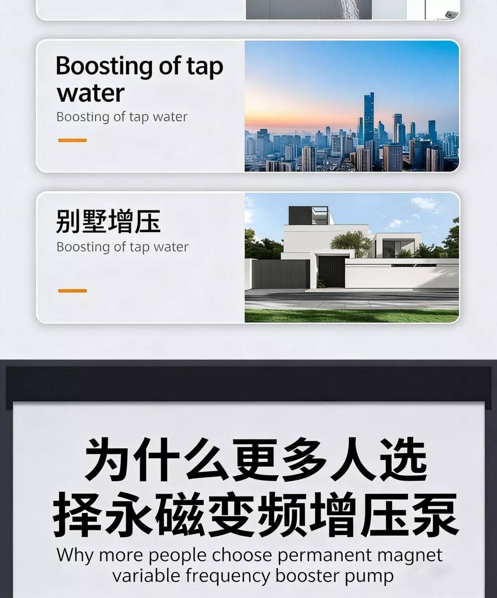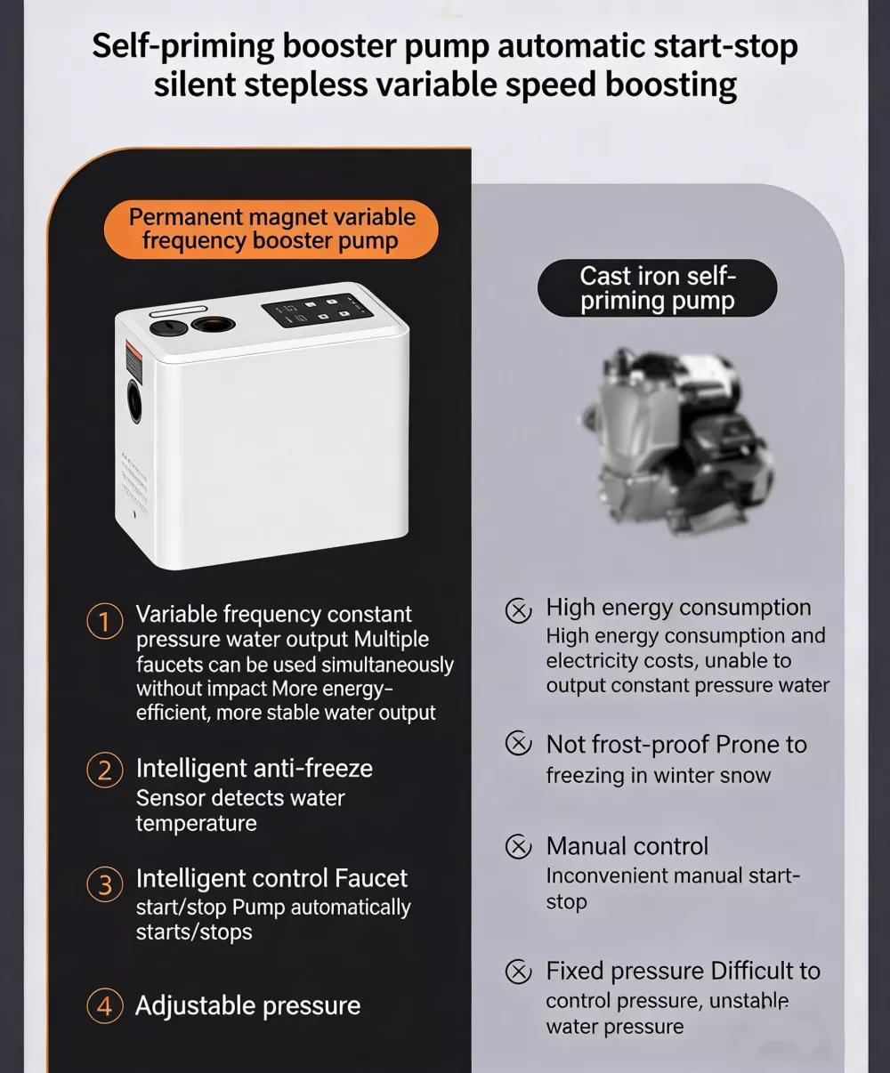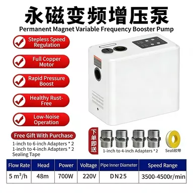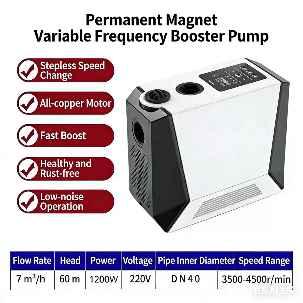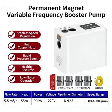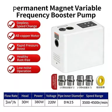 Når du leder efter en højkvalitets husholdningsvandtryksforøgende løsning, er Permanent Magnet Variable Frequency Booster Pump dit overlegne valg. Sammenlignet med almindelige boosterpumper på markedet er vores produkt udstyret med fuldt intelligent kontrolsystem, stabil variabel frekvens konstant trykfunktion, ultra-lavt støjdriftsdesign, højhastighedsmotor med høj effekt, intelligent frostbeskyttelse og kompakt stilfuldt udseende. Det løser perfekt de almindelige mangler ved traditionelle pumper, såsom besværlig manuel betjening, ustabilt vandtryk, høj driftsstøj, let frostskader om vinteren og omfangsrig og vanskelig installation.