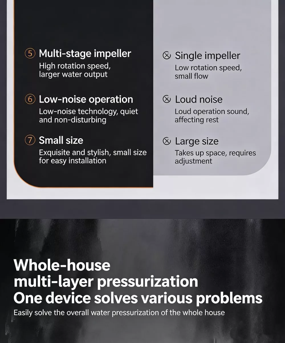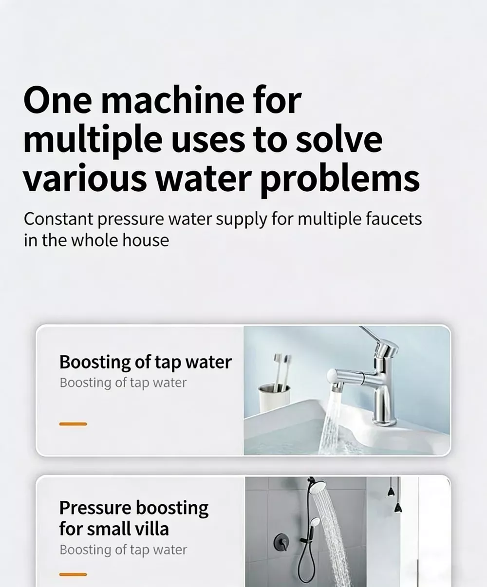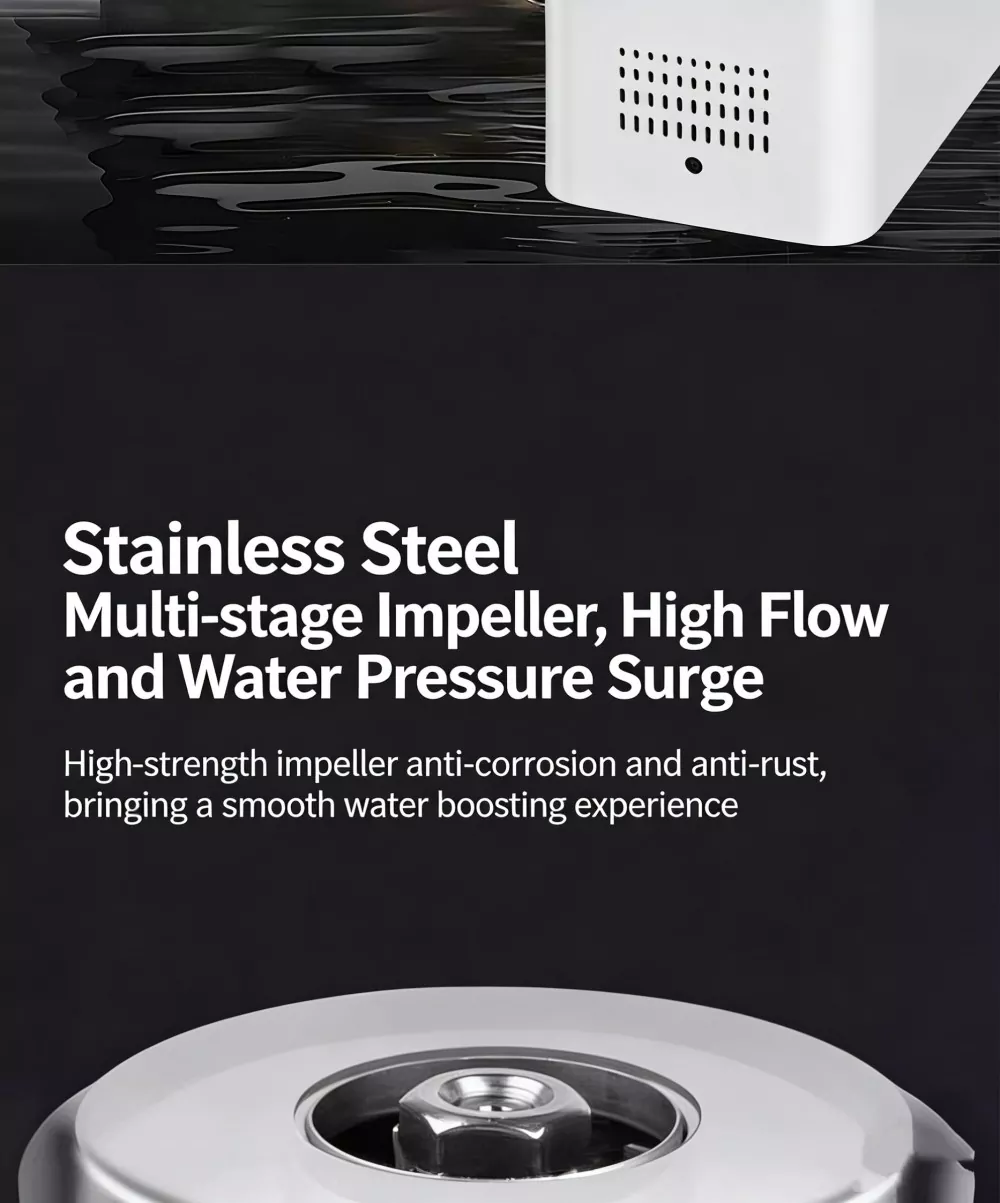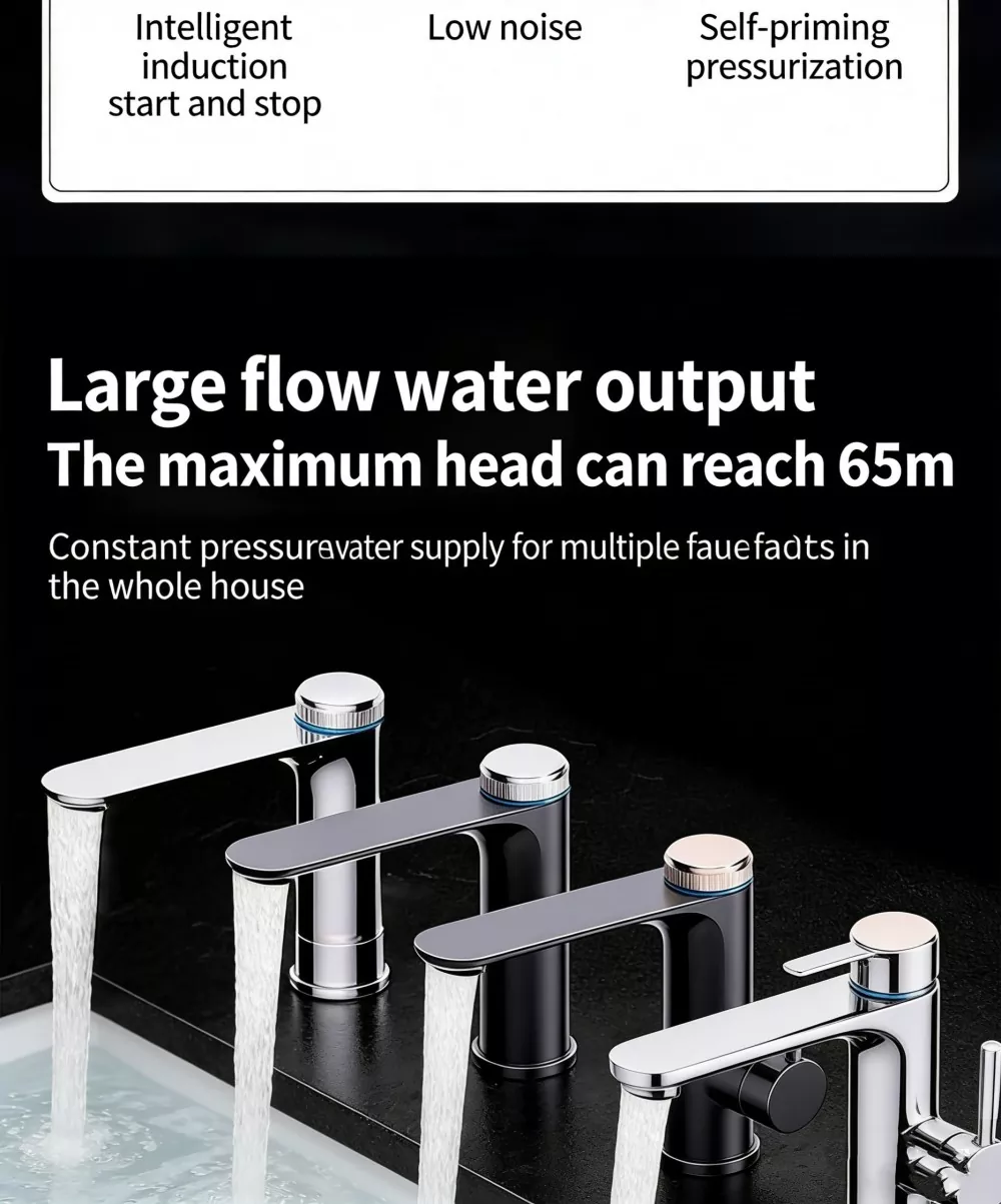 Højhastighedsmotor: Den indbyggede 6500 RPM højhastighedsmotor bringer bølgende kraft, leverer stærk og stabil storstrømsvandudgang og løser grundigt problemet med utilstrækkeligt husholdningsvandtryk.