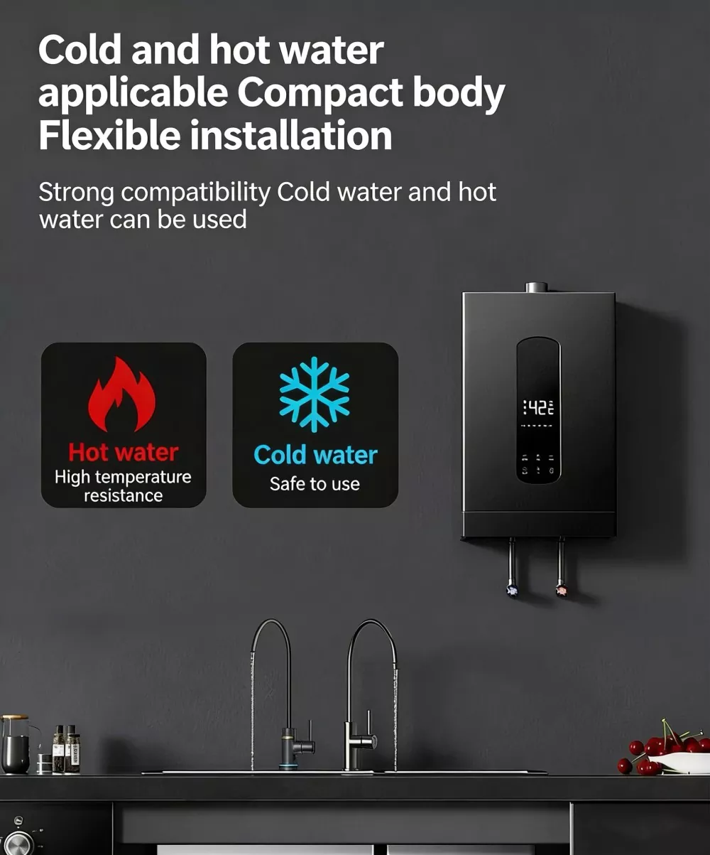 Korrosionsbestandig grænseflade: Vandindtaget og -udløbet er lavet af rent kobbermateriale, som har fremragende korrosionsbestandighed og rustbestandighed, holdbart til langvarig brug, sikkert og miljøvenligt og opfylder sikkerhedsstandarderne for husholdningsdrikkevand.