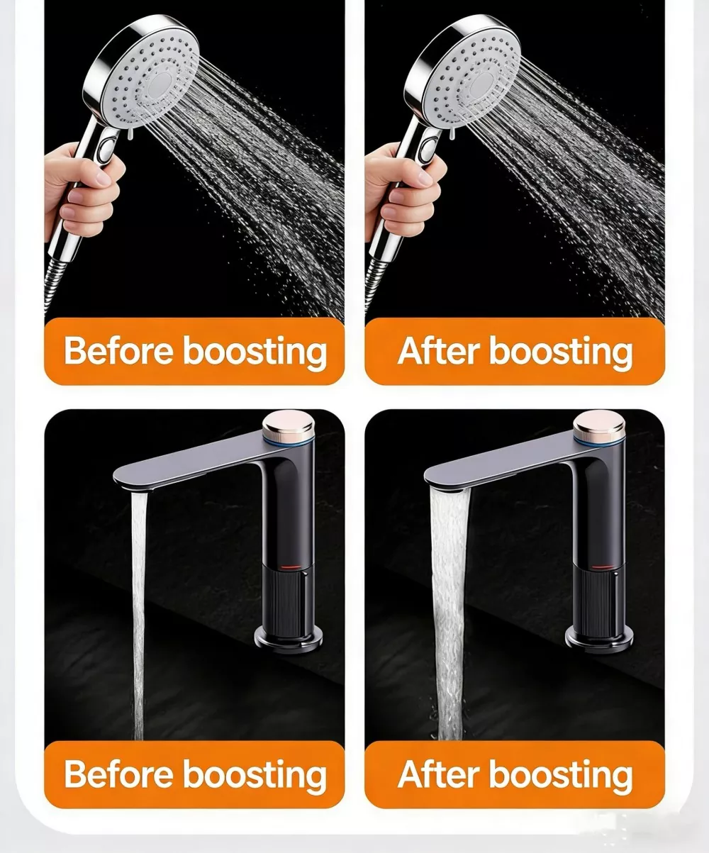 Efter: Stærk og stabil hurtig vandgennemstrømning, konstant vandtryk, selv når flere udtag er åbne på samme tid, hvilket giver en behagelig og forfriskende bruseoplevelse, der fuldt ud opfylder alle daglige vandbehov i husholdningen.