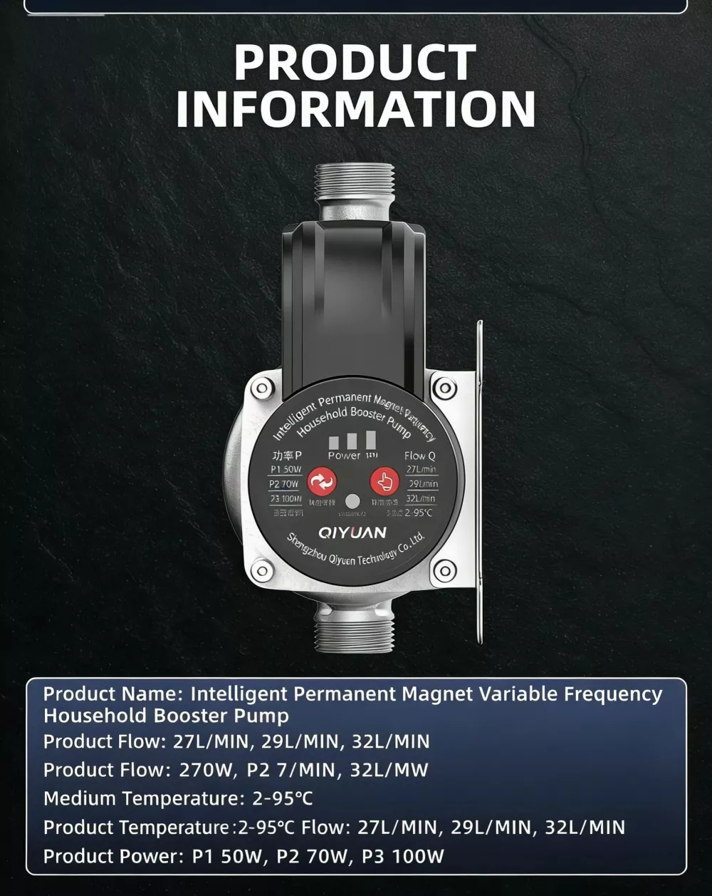 Ved at anvende et avanceret permanent magnet variabel frekvens kontrolsystem justerer den automatisk rotationshastigheden i henhold til det faktiske vandbehov, med tre tilgængelige trykniveauer (lavt/medium/højt tryk). Den sikrer en behagelig vandforsyning, samtidig med at den leverer enestående energieffektivitet og sparer over 30 % mere energi end traditionelle boosterpumper.