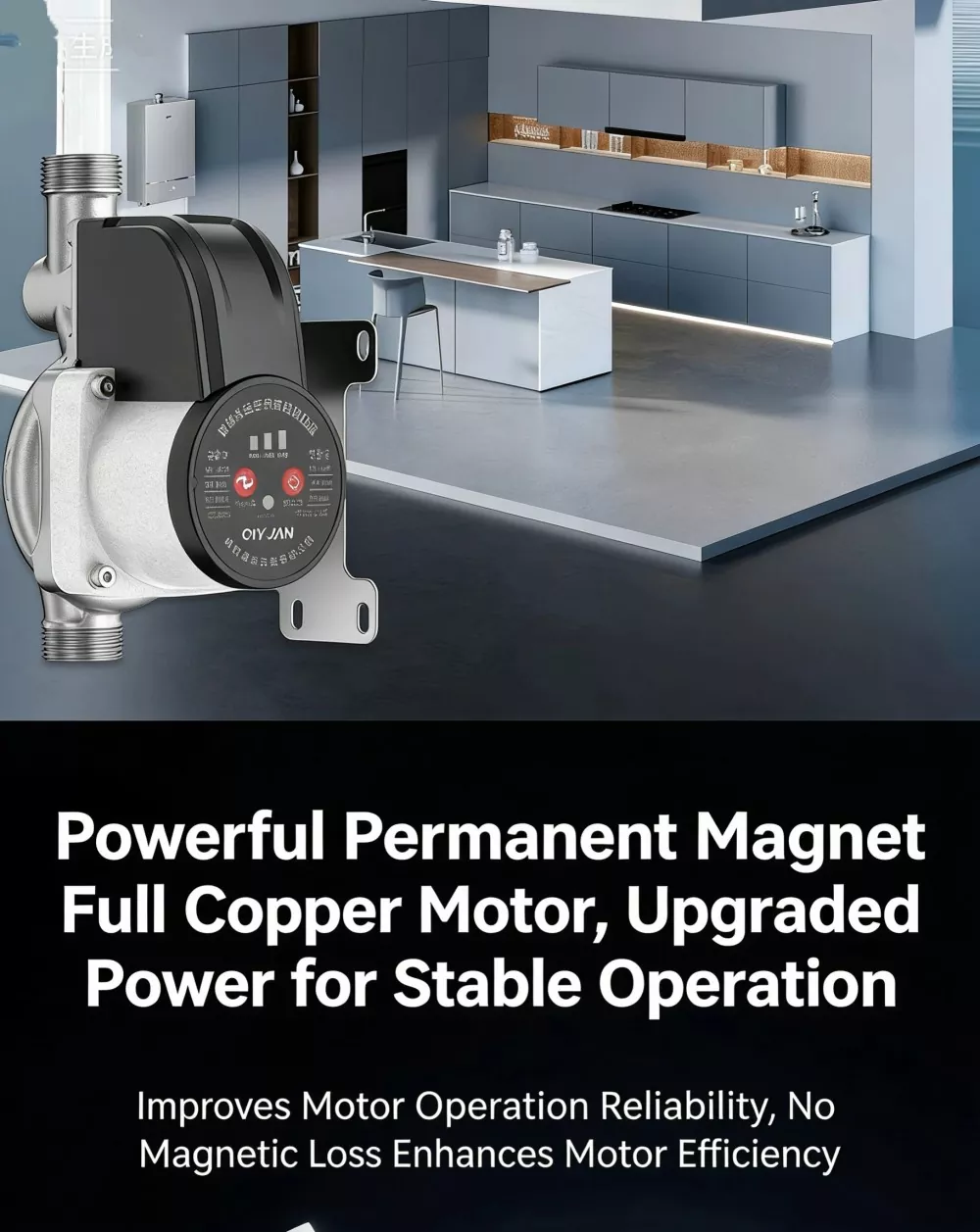 Udstyret med en børsteløs permanentmagnetmotor og præcisionslejer kører pumpen med ekstremt lavt støjniveau, hvilket ikke forstyrrer dagligdagen, selv når den er installeret indendørs. Motoren har fulde kobberviklinger for fremragende varmeafledning og lang levetid.